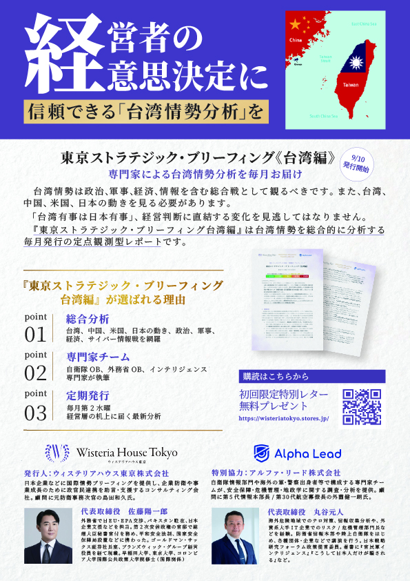 弊社ウィステリアハウス東京株式会社は、アルファ・リード株式会社(東京都千代田区九段南4-3-4 Polar 九段 1F。代表取締役 丸谷元人)からのご協力を得て、台湾情勢に特化した経営層向け有料レポート「東京ストラテジック・ブリーフィング《台湾編》」を、本日9月10日より提供いたします。